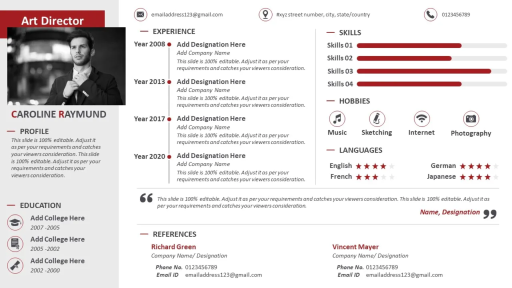 Creating an eye catchy resume is a very time-consuming task. You can use predesigned resume PowerPoint templates to showcase your expertise, experiences, and future goals. Here are a few samples of creative resume PPT templates that can be used to easily impress recruiters.