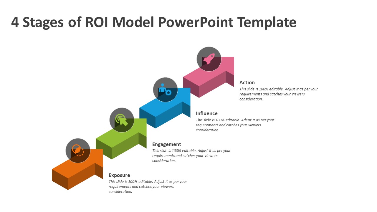 The 4 Stages of ROI Model PowerPoint Template is a professionally designed, fully customizable presentation ideal for showcasing marketing and business performance journeys. It visually represents the complete ROI cycle through four structured stages: Exposure, Engagement, Influence, and Action. This model helps businesses, marketers, and analysts clearly communicate how audience interaction translates into measurable results. Perfect for strategy presentations, digital marketing reports, and stakeholder meetings, the PPT template enhances clarity and visual storytelling.