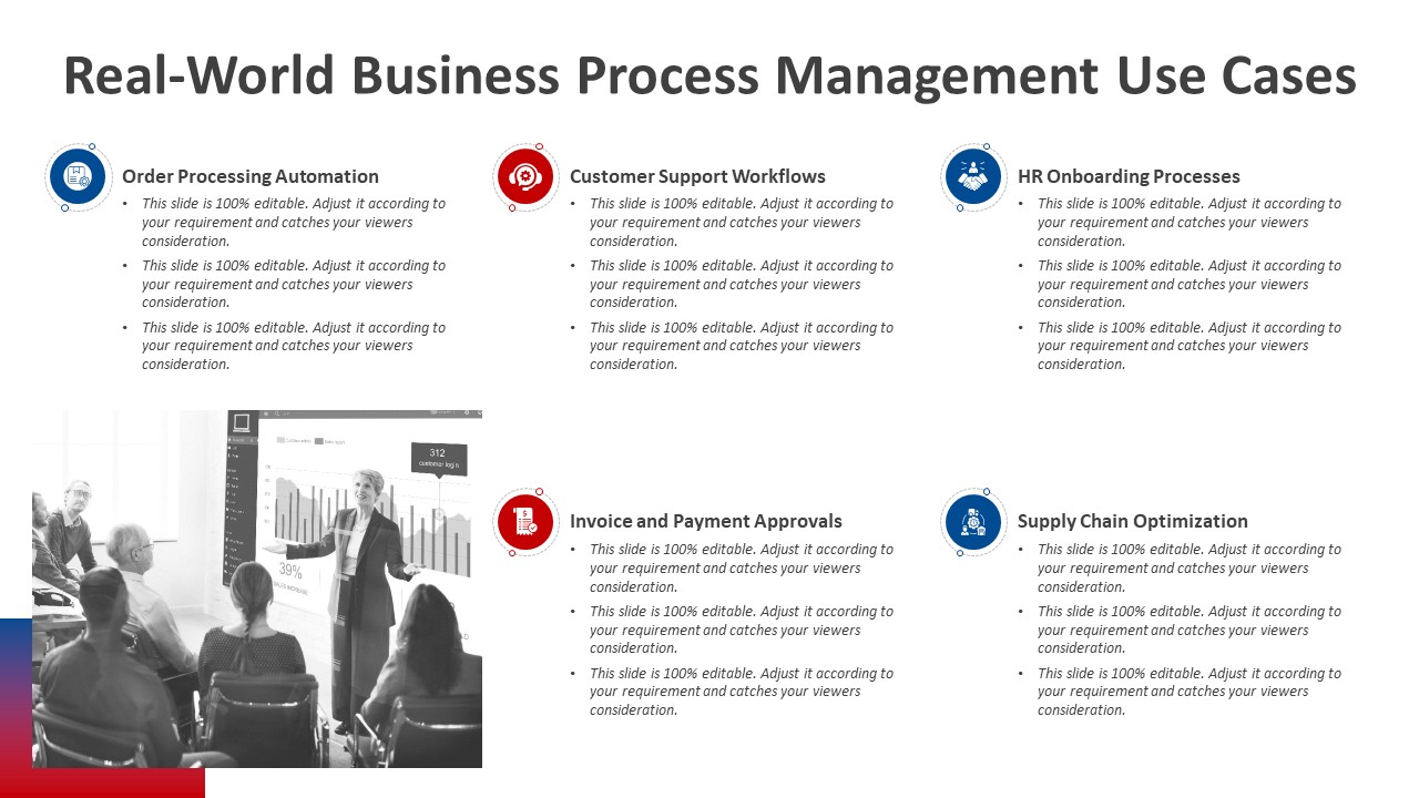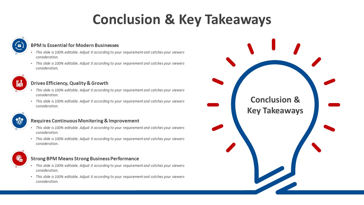 Business Process Management Complete Deck PowerPoint Template is a professionally designed, ready-to-use presentation covering BPM concepts, lifecycle, use cases, challenges, and real-world examples. Ideal for consultants, enterprises, startups, students, and trainers to explain, analyze, and improve business processes clearly.