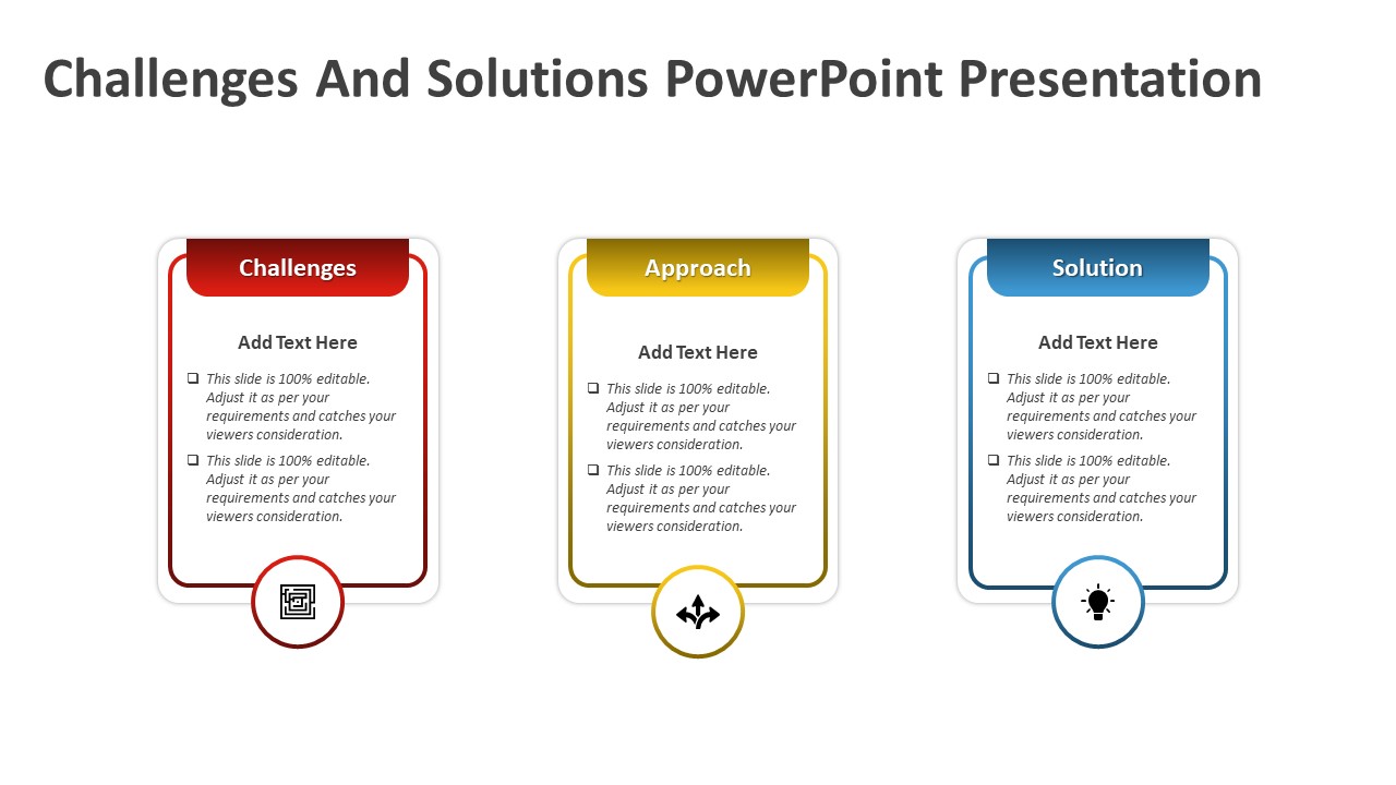 The Challenges and Solutions PowerPoint Presentation is a professionally designed PPT template ideal for clearly presenting business problems and actionable strategies. This fully customizable PPT slide helps professionals, consultants, project managers, and educators visually outline key challenges, the approach taken to address them, and the resulting solutions in a structured format. Perfect for strategy meetings, project reviews, business reports, and corporate discussions, this slide enables audiences to quickly understand problems and solution pathways with clarity and impact.