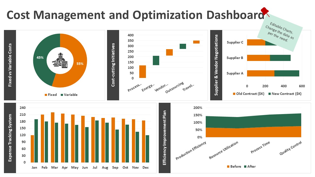 The Cost Management and Optimization Dashboard PowerPoint Template is a fully customizable presentation toolkit designed to help businesses track expenses, analyze financial performance, and optimize spending at every operational level. This template includes professionally designed dashboards that display KPIs in a clean, modern layout. Ideal for finance teams, project managers, and business leaders, it enables you to communicate financial insights with clarity and impact.