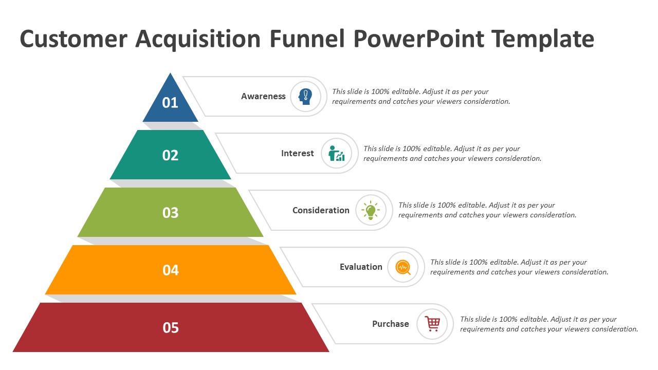 The Customer Acquisition Funnel PowerPoint Template is a professionally designed PPT to visualize your marketing journey from awareness to purchase. Covering key stages – awareness, interest, consideration, evaluation, and purchase, this fully customizable PPT template helps businesses, marketers, and startups present data-driven strategies with clarity and impact. This PPT template enables you to communicate your customer acquisition process effectively while enhancing audience engagement and decision-making.