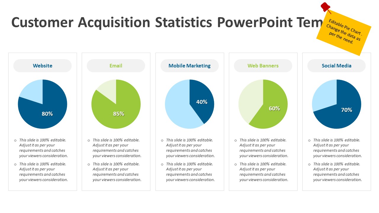 The Customer Acquisition Statistics PowerPoint Template is a professionally designed presentation template that helps businesses visualize and communicate key customer acquisition metrics with clarity. Ideal for marketing teams, startups, and sales professionals, this fully customizable slide allows you to present important statistics such as website, email, social media marketing, and mobile marketing in a clear and engaging format. Whether used in strategy meetings, marketing reports, or investor presentations, this slide simplifies complex customer acquisition data and enhances data-driven storytelling.