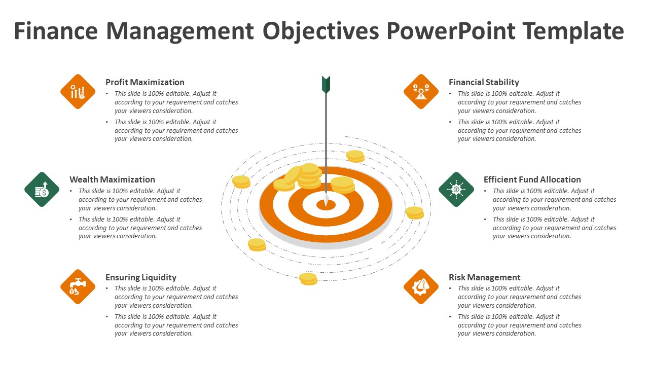 The Finance Management Objectives PowerPoint Template is a fully customizable PPT template created to help finance professionals, educators, and business leaders present their financial goals with clarity and impact. Ideal for corporate meetings, academic sessions, and strategic planning presentations, this template allows you to visually communicate key financial objectives such as budgeting, cost control, profitability, and growth. Its clean, modern layout ensures that your message stands out while maintaining a professional tone.