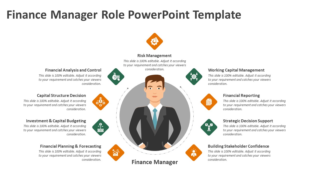 The Finance Manager Role PowerPoint Template is a fully customizable PPT template created to present the key responsibilities, skills, and functions of a finance manager with clarity and professionalism. Ideal for corporate presentations, training sessions, and executive meetings, this template allows you to highlight financial planning, budgeting, analysis, and leadership roles in a visually engaging way. Whether you’re a business consultant, HR professional, or educator, this Finance Manager Role PowerPoint Template helps you communicate complex financial concepts with simplicity. Compatible with PowerPoint and Google Slides, it’s perfect for modern, data-driven business environments.