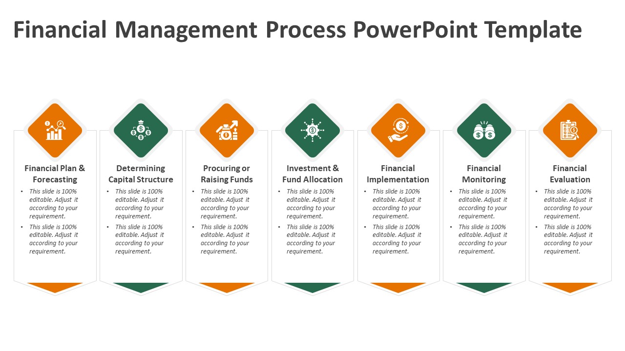 The Financial Management Process PowerPoint Template is a fully customizable PPT template designed to illustrate key stages of financial planning, control, and decision-making. Ideal for finance professionals, educators, and business leaders, this template helps visualize the complete financial management workflow – from budgeting and forecasting to performance analysis and reporting. With clean design, editable graphics, and clear process flow, it’s perfect for board meetings, investor presentations, and financial strategy sessions.