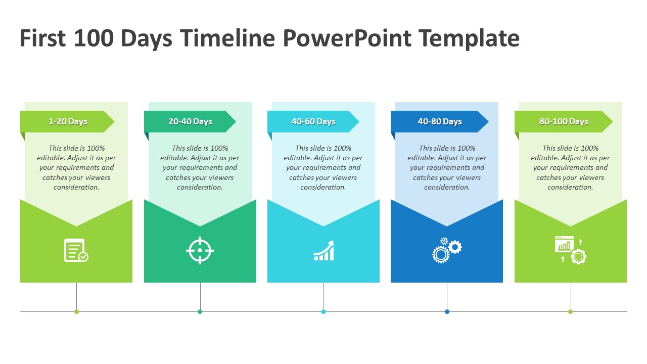 The First 100 Days Timeline PowerPoint Template is a professionally designed presentation created to help leaders, managers, HR teams, and consultants clearly outline strategic plans for the first 100 days in a new role, project, or business launch. This fully customizable PPT template enables you to visually present milestones, key goals, performance benchmarks, and action plans in a structured timeline format. Ideal for corporate onboarding, executive transitions, startup roadmaps, and change management presentations, it ensures clarity and impact.