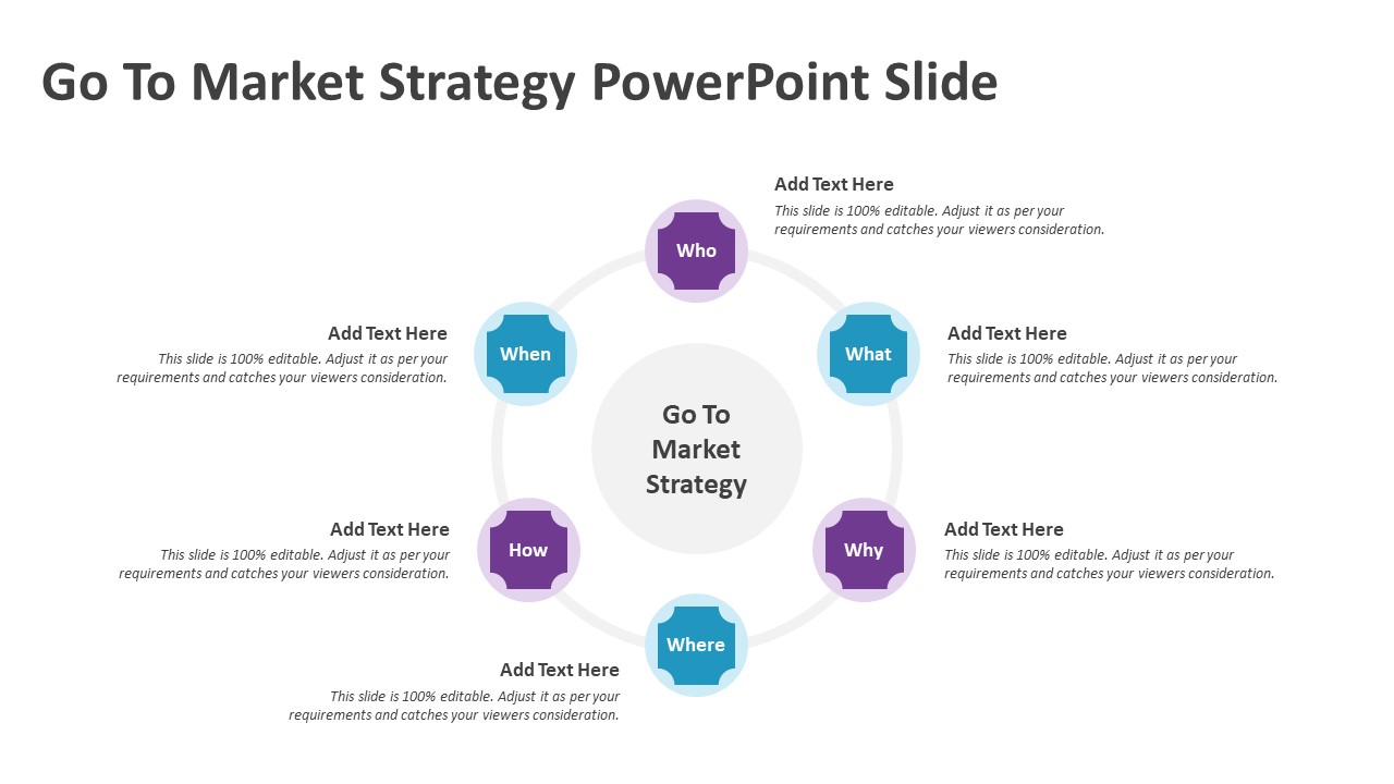 The Go To Market Strategy PowerPoint Slide is a professionally designed presentation template that helps businesses clearly structure and communicate their market entry strategy. Built around the six essential questions – Who, What, Where, When, Why, and How, this slide enables teams to present strategic insights, customer targeting, product positioning, launch timelines, and distribution plans in a simple and visually engaging format. Ideal for startups, marketers, consultants, and business strategists, the slide helps simplify complex planning into an easy-to-understand framework.