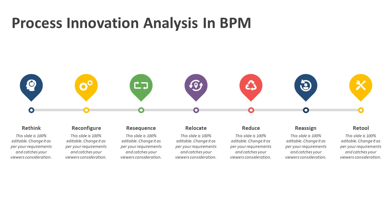 The Process Innovation Analysis In BPM PowerPoint Template is a professionally designed presentation built for business leaders, consultants, and operations teams aiming to optimize workflows and drive measurable efficiency. Ideal for Business Process Management (BPM) initiatives, this fully customizable slide helps visualize rethink, resequence, reduce, and retool in a clear, structured format. Its modern layout supports data-driven storytelling for corporate meetings, strategy workshops, and digital transformation projects.