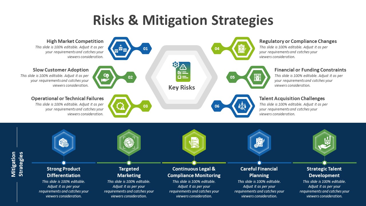 The Risks and Mitigation Strategies PowerPoint Template is a professionally designed PPT template that helps businesses clearly present potential risks and actionable mitigation plans in meetings, reports, and strategy presentations. Built for project managers, consultants, startups, and corporate teams, this fully customizable slide allows you to easily edit colors, text, icons, and layouts to match your brand. Its clean, structured design improves decision-making by visually organizing risk assessment and response strategies, making it ideal for corporate presentations, project reviews, and stakeholder briefings across industries worldwide.