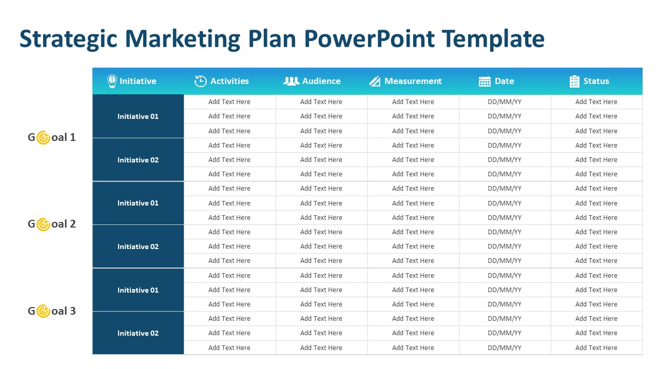 The Strategic Marketing Plan PowerPoint Template is a professionally designed, fully customizable presentation crafted for marketers, strategists, and business professionals. It helps clearly outline marketing goals, key initiatives, supporting activities, target audience, performance measurements, timelines, and current status in a structured and visually impactful format. Ideal for corporate strategy meetings, agency pitches, and business planning sessions, this PPT template ensures clarity and alignment across teams.