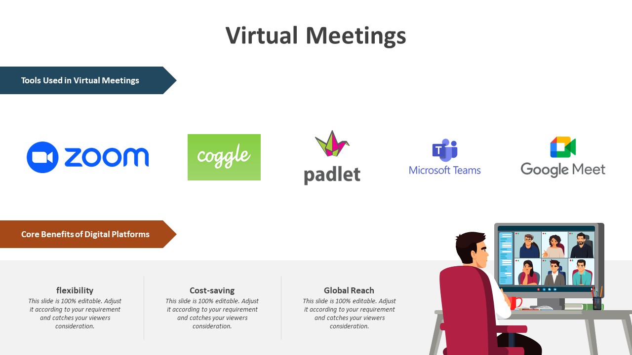 The Virtual Meetings PowerPoint Template is a professionally designed PPT ideal for showcasing the essential tools and key benefits of digital collaboration. Perfect for businesses, educators, and remote teams, this fully customizable slide highlights popular virtual meeting platforms alongside their core advantages such as flexibility, cost saving, and global connectivity. Optimized for professional use, this PPT template ensures your message is both visually engaging and easy to understand in today’s digital-first workspace.